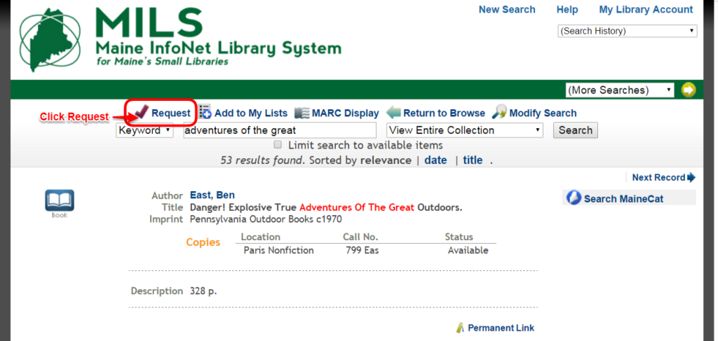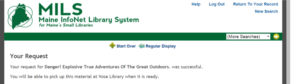 - If successful, the following message will appear:”Your request for [Title] was successful. You will be able to pick up this material at [Library Name] when it is ready.”