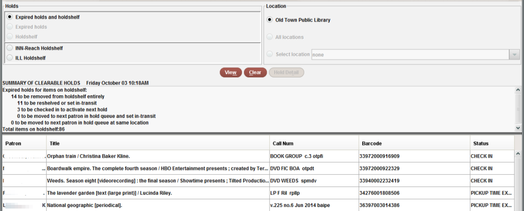 - Expired holds and holdshelf: all defunct holds (Recommended)